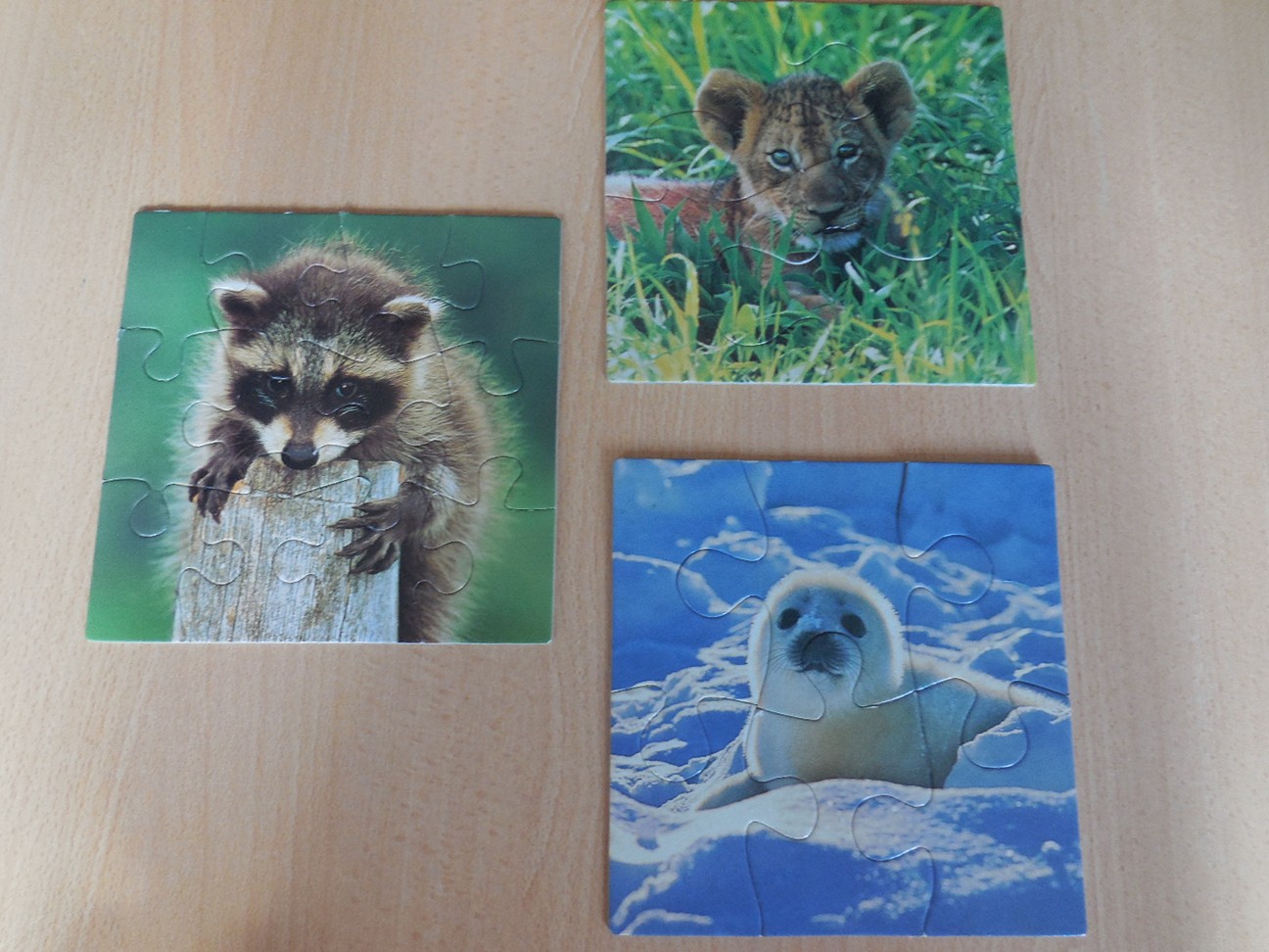 De puzzels behandelen het thema “wilde dieren” en hebben de kleurige afbeelding van: een vosje, een eekhoorn, een zeehond en een welpje.