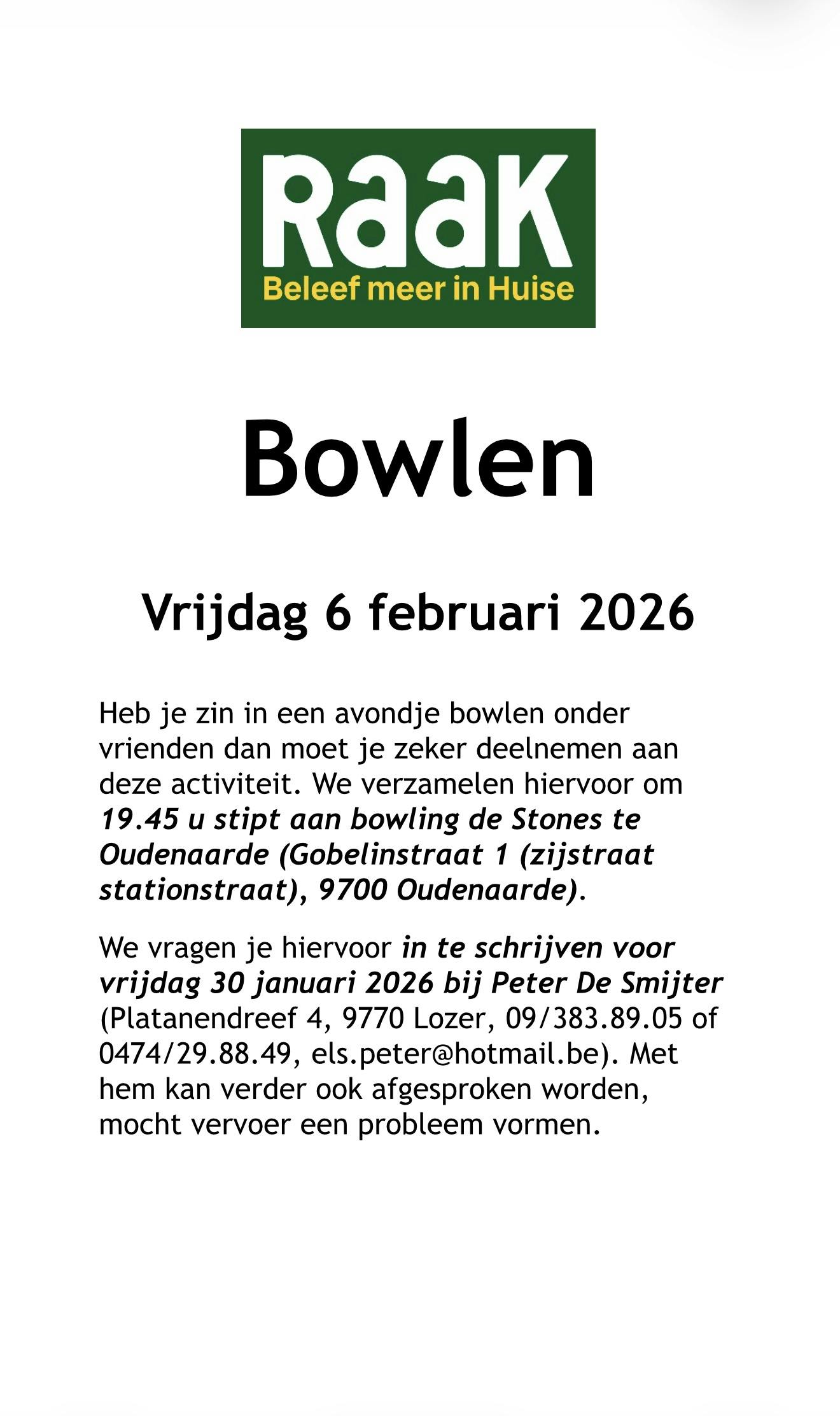 Op vrijdag 6 februari gaan we met Raak Huise bowlen, hierbij is iedereen welkom.