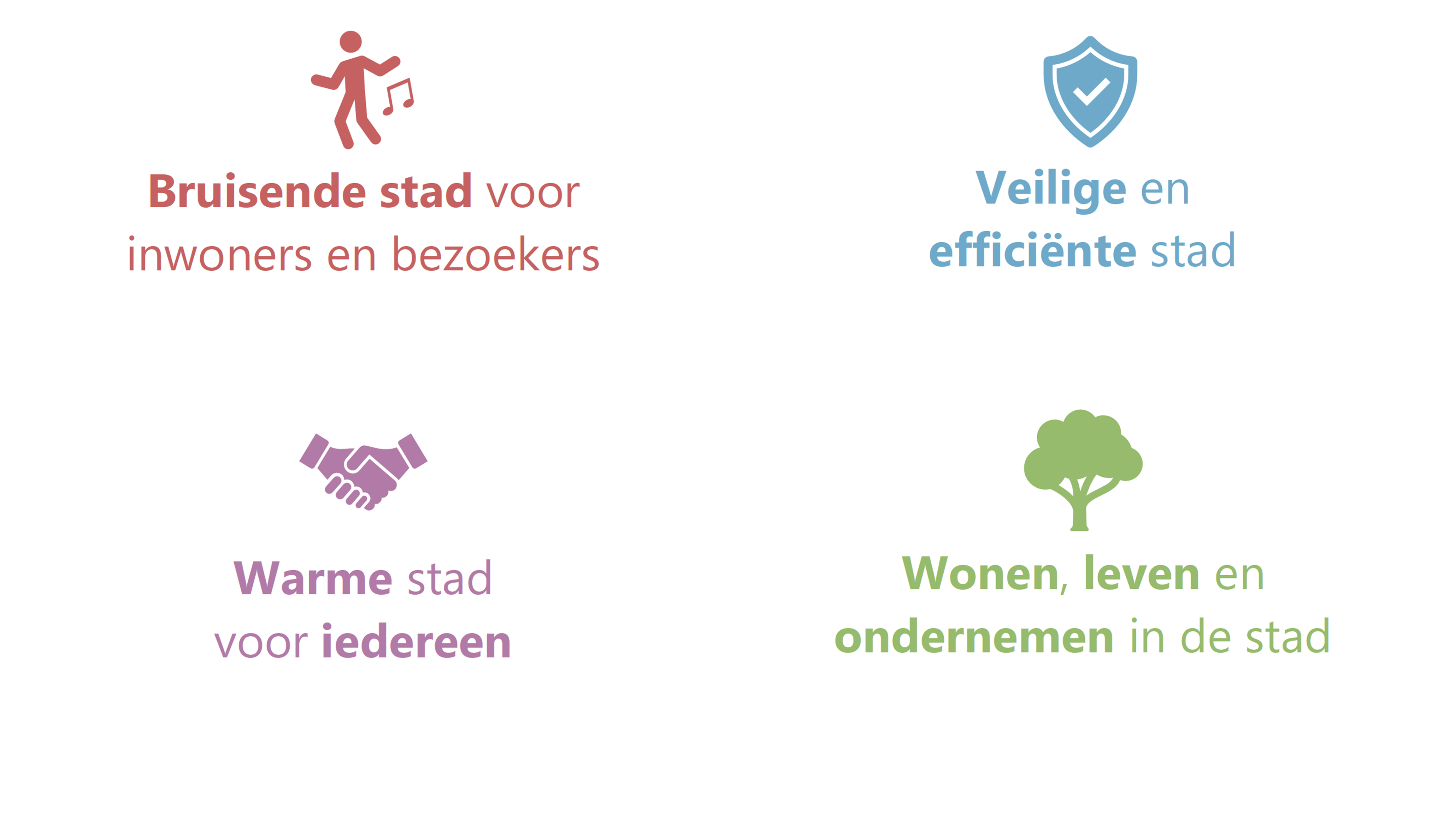 Om richting te geven aan het beleid voor de komende jaren, bundelen we onze ambities in vier centrale doelstellingen. Ze vormen samen het kompas van dit meerjarenplan en vertalen de visie van het bestuur naar concrete maat-schappelijke uitdagingen. Deze doelstellingen raken aan alle aspecten van het leven in onze stad: van zorg tot veiligheid, van vrije tijd tot ondernemen en wonen.