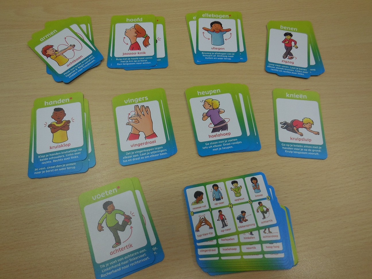Op elke kaart staat een beweegopdracht met een illustratie en verduidelijkende tekst.